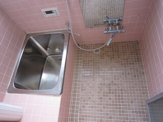 ステンレス浴槽、シャワー付き。都市ガス追い焚き付きボイラーからの給湯です。